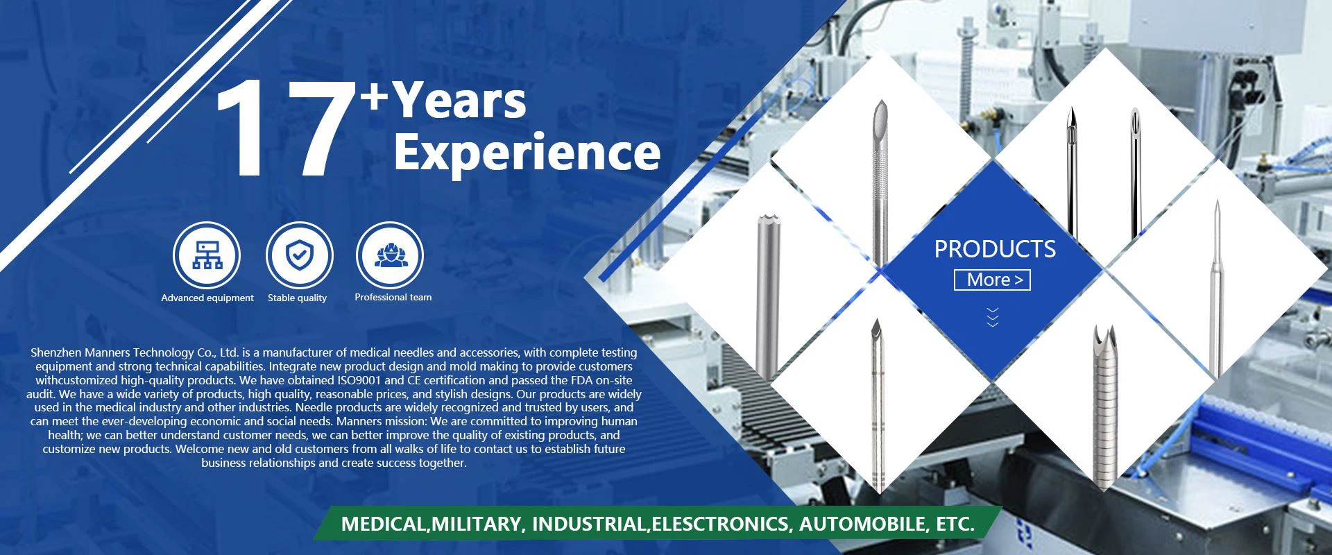 Shenzhen Manners Technology Co., Ltd دنیا کی کچھ مشہور بین الاقوامی کمپنیوں جیسے بلم نووٹیسٹ کا فراہم کنندہ ہے۔ کومیٹ، جنیوا لیب۔ BTL، TeesuVac، Limaca-میڈیکل، وغیرہ۔ ہم سوئی کی تیاری، ملٹی ایکسس CNC مشینی، سوئس قسم کی ٹرننگ، لیزر کٹ نلیاں، لیزر ویلڈنگ اور میڈیکل، اینڈوسکوپک آرتھروسکوپک، آرتھوپیڈک، آٹوموٹو، اور خصوصی اسمبلیوں میں مہارت رکھتے ہیں۔ صنعتی منڈیوں.